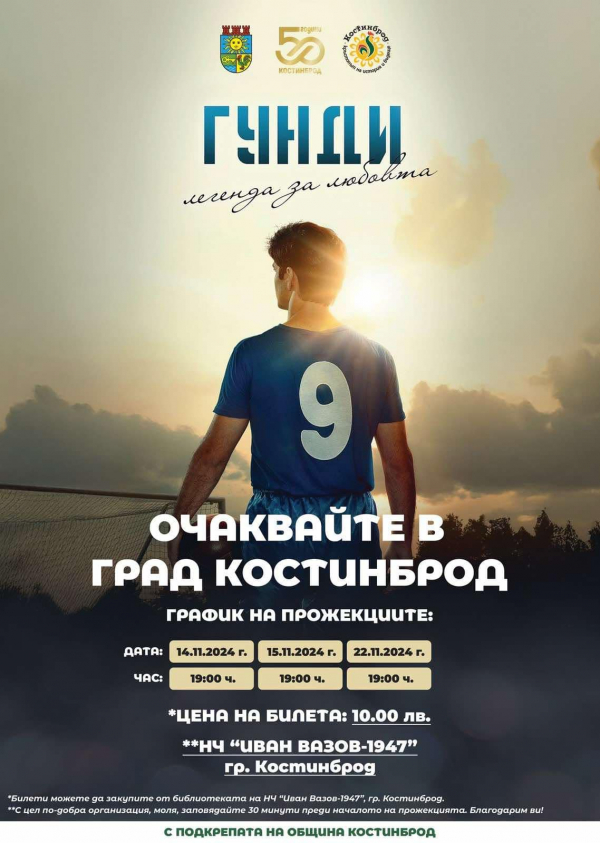 Поради големия интерес, Община Костинброд и Народно читалище „Иван Вазов 1947“ обявиха допълнителна дата за прожекция на българския филм „Гунди – Легенда за любовта“. Всички, които не са успели да си закупят билети за първите две прожекции, могат да го направят за новата дата – 22 ноември. Прожекцията ще се състои в големия салон на НЧ „Иван Вазов 1947“ и е с начален час 19.00 ч.
