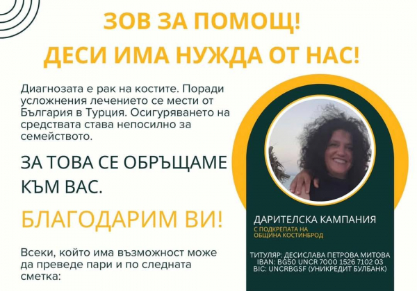 Дарения могат да се правят на сметка с IBAN: BG50 UNCR 7000 1526 7102 03, BIC: UNCRBGSF, на името на Десислава Петрова Митова, и чрез линка ТУК.