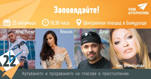 Георги Димитров, кандидат кмет на община Божурище и листата за общински съветници от ПП „Нова алтернатива“ ще закрият предизборната кампания за Местни избори 2019 с концерт.