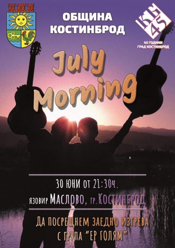 С много песни и добро настроение в Костинброд ще посрещнат July morning 2019. На 30 юни от 21:30 ч. на яз. „Маслово“, всички любители на рок музиката могат да се насладят на изпълненията на бандата „Ер голям“, след което заедно ще посрещнат първият изгрев на месец юли.