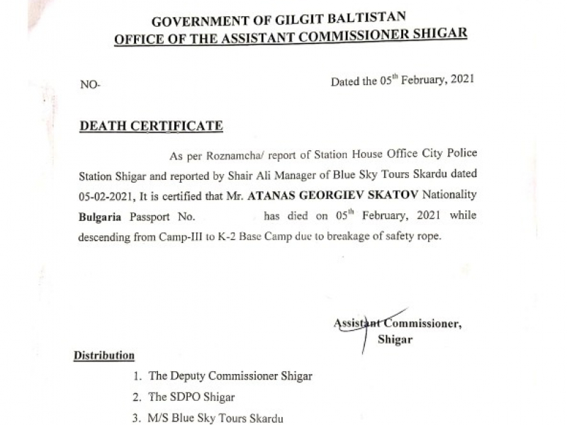 Припомняме, че официално скъсано осигурително въже е причинило падането на българския катерач Атанас Скатов в подножието на връх К2. Това е записано в смъртния акт, издаден от пакистанските власти, който първоначално беше изпратен до в-к "24 часа".