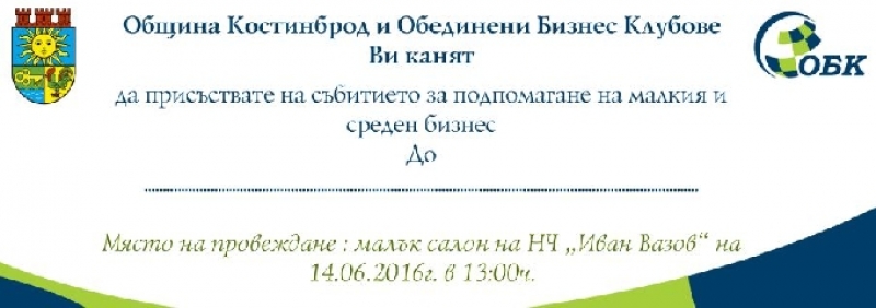 На 14 юни в малък салона на НЧ "Иван Вазов", от 13 часа, ще е проведе среща по повод подпомагането на малкия и средния бизнес.