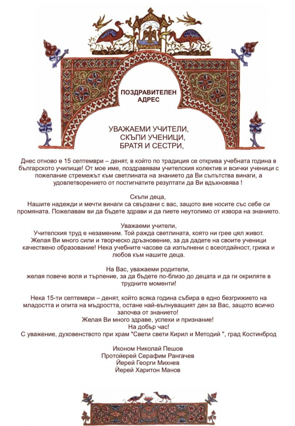 Иконом Николай Пешов, Протойерей Серафим Рангачев, Йерей Георги Михнев и Йерей Харитон Манов от храм „Св. Св. Кирил и Методий“ в Костинброд отправиха поздравителен адрес към ученици, учители и родители по случай началото на новата учебна година.