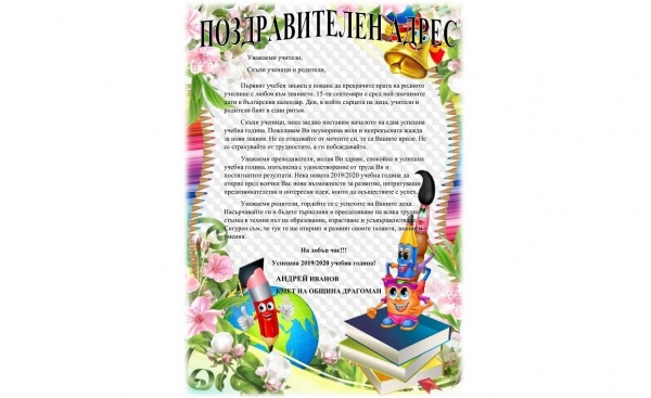 Поздравителен адрес от кмета на община Драгоман за първия учебен ден