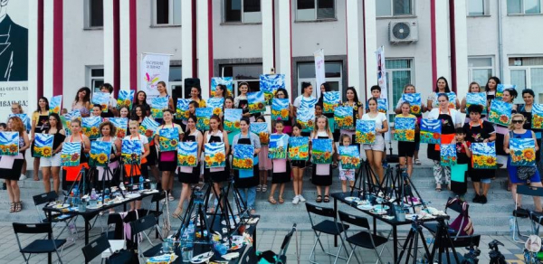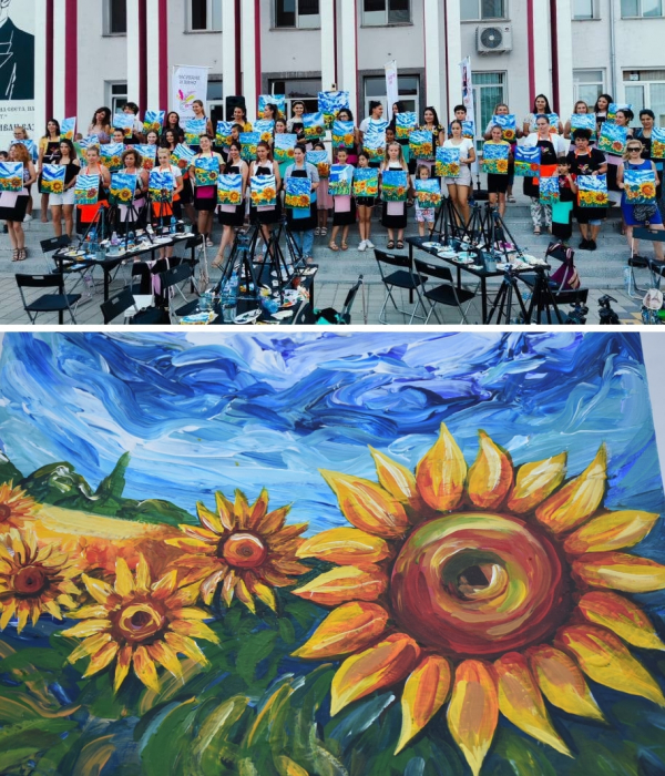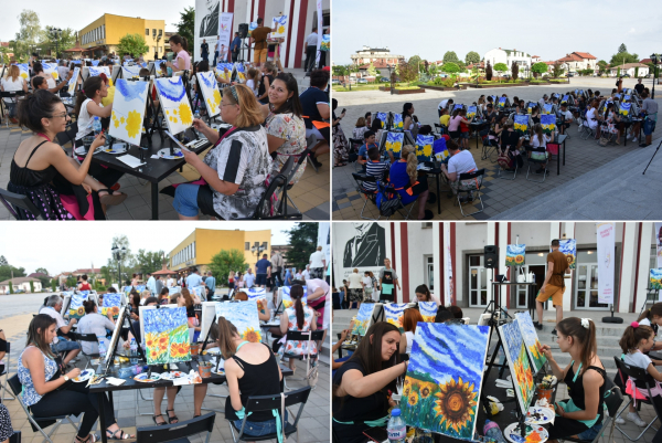 Поле от усмихнати слънчогледи „разцъфтя“ на площад „Иван Вазов“ в Костинброд, в рамките на събитието „Рисуване и вино“, организирано от Община Костинброд.