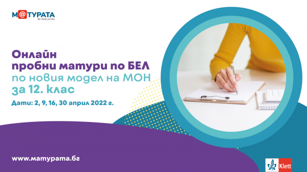 През април, онлайн ще се проведат четири пробни матури по български език и литература за 12. клас. Датите на провеждане са 2, 9, 16 и 30 април, като изпитите са изцяло съобразени с новия формат на МОН. Явилите се ще получат детайлна обратна връзка от експерти оценители както на тестовата част, така и на въпросите със свободен отговор. Всички желаещи могат да заявят участие за една или за пакет от четирите пробни матури тук.