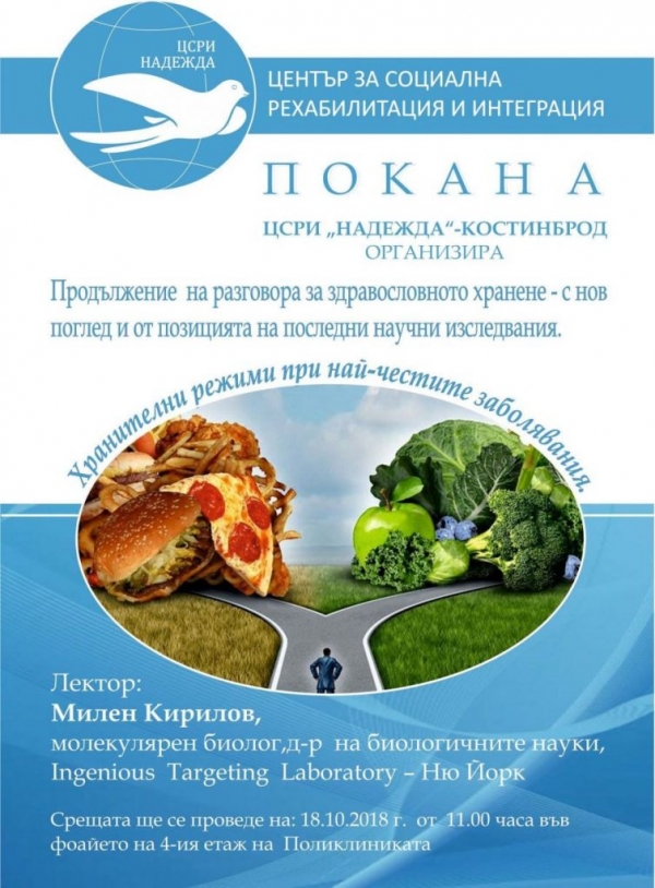 Лектор ще бъде Милен Кирилов, който ще разясни на присъстващите хранителните режими, подходящи за профилактика на най-честите заболявания.