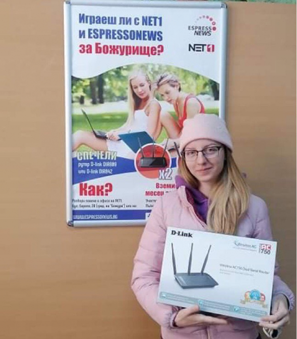 Последният победител в нашата #ИграсNET1заБожурище e Зори Мирославова. Тя получи своята наградата супер рутер D-link в офиса на NET 1 в гр. Божурище.