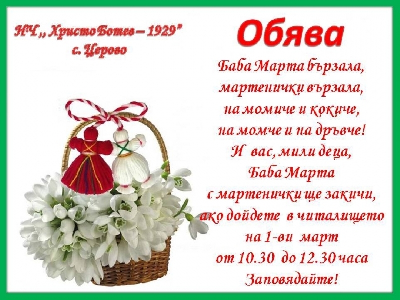 Народно читалище "Христо Ботев - 1929, село Церово, кани най-малките жители на селото да посрещнат заедно традиционния български празник "Баба Марта" и да се закичат с мартеници за здраве. Вратите на културната институция ще са отворени за малчуганите на първи март от 10:30 ч. до 12:30 ч., като всички отзовали се на поканата ги очакват много положителни емоции и усмивки.