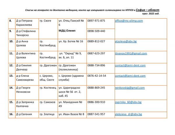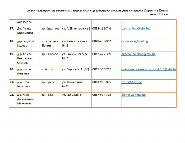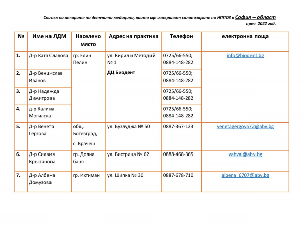 Ето и таблица с лекарите по дентална медицина за София област, които участват в Програмата: