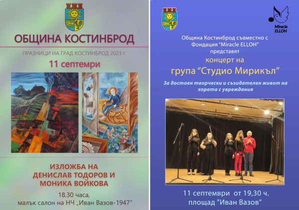 Празници на град Костинброд 2023: Изложба на Денис Тодоров и Моника Влайкова и концерт на Студио Мирикъл