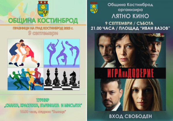 Лятно кино с хитовата българска лента „Игра на доверие“ ще зарадва костинбродчани, вечерта на 9 септември. Мястото е площад „Иван Вазов“ в града, а началния част е 21.00 ч. Вход свободен. Събитията са част от празничната програма, с която Костинброд ще отбележи своята 49-годишнина.