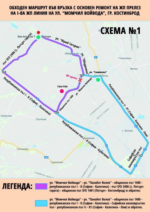 Поради предстоящото затваряне на жп прелеза на ул. „Момчил Войвода”, в периода от 08:00 ч. на 22.10.2018 г. до 18.00 ч. на 26.10.2018 г., Община Костинброд предлага два обходни маршрута, сигнализирани с пътни знаци за движение на МПС: