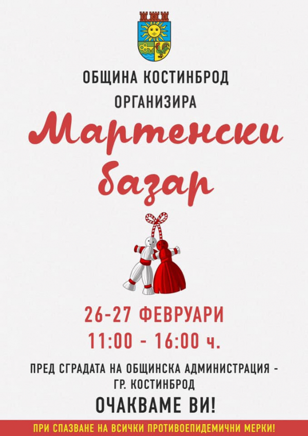 За поредна година, Община Костинброд организира мартенски базар. Тази година инициативата ще се проведе на  26 /петък/ и 27 февруари /събота/ от 11:00 до 16:00 ч. Базарът ще бъде разположен пред сградата на Общинската администрация и ще започне от 11:00 ч. в петък и от 10:00 ч. в събота.