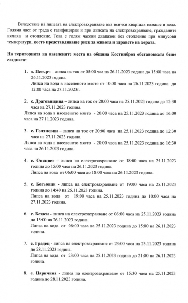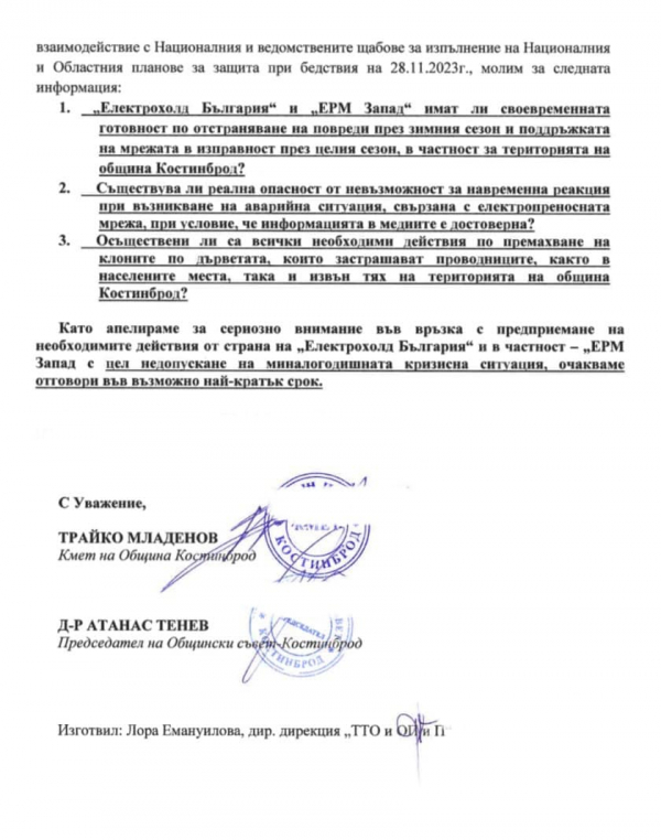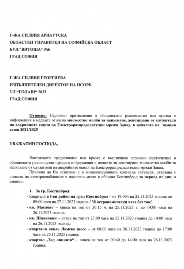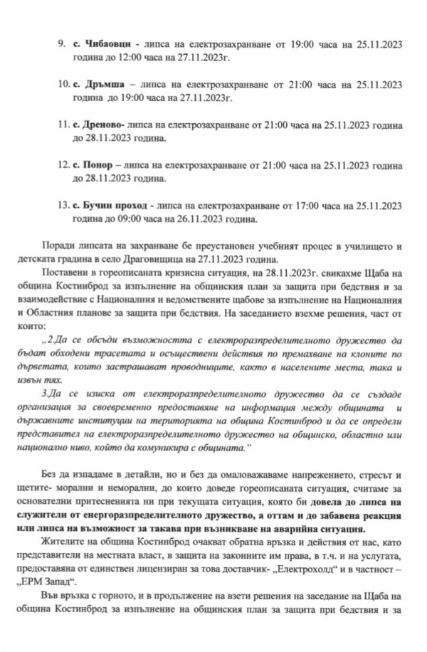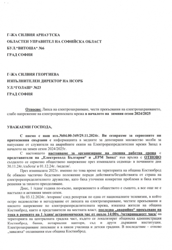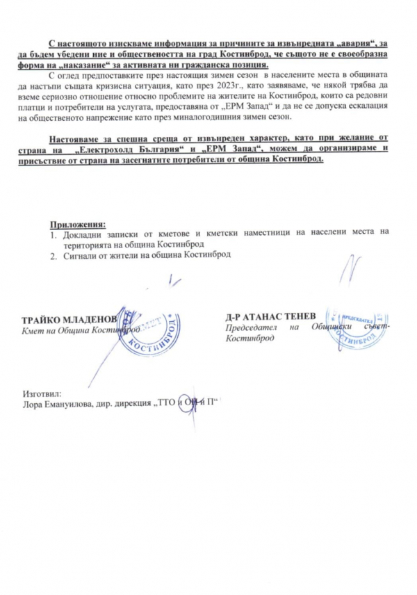 От местната администрация апелират към всички потърпевши да подават сигнали към Електроразпределително дружество „ЕРМ-Запад“, с копие до община Костинброд, за да бъдат предприети нужните действия. От общината посочват, че не могат да останат безучастни към случващото се и продължават да наблюдават ситуацията, като настояват за адекватни мерки от страна на електроразпределителното дружество.