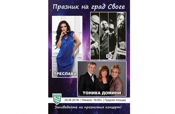 Голям спектакъл очаква жителите и гостите на общината за празника на град Своге. Цяло съзвездие от най-обичаните музикални изпълнители пристига в шоколадовия град на 29 юни. Началото на тържествения концерт е в 19:00 ч. на градския площад.