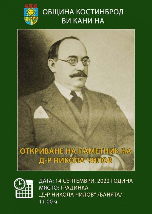 На 14 септември, от 11.00 ч., ще бъде официално открит бюст-паметника на д-р Никола Чилов. Мястото е градинка „Д-р Никола Чилов“ /банята/.