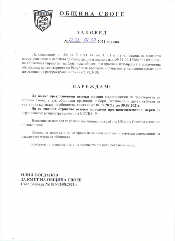 До 30.09.2021 г. се преустановяват се всички масови мероприятия на територията на община Своге. Това става ясно от заповед на ЗА кмета на община Своге - Илия Богданов.
