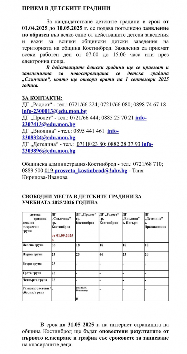 До 31.05.2025 г. на интернет страницата на община Костинброд ще бъдат оповестени резултатите от първото класиране и график със сроковете за записване на класираните деца.
