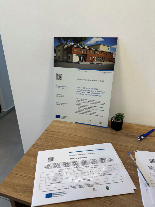 На 01.10.2024 г., в Информационен център – гр. Костинброд, се проведе Откриваща пресконференция за представянето на Предложение за изпълнение на инвестицията (ПИИ) № BG-RRP-4.020-0268 „Внедряване на мерки за енергийна ефективност н НЧ „Нов живот – 1919“, с. Петърч, община Костинброд“, който се реализира с безвъзмездната финансова подкрепа на Националния план за възстановяване и устойчивост, по процедура № BG-RRP-4.020 „Подкрепа за устойчиво енергийно обновяване на публичен сграден фонд за административно обслужване, култура и спорт“, финансиран от Европейски сьюз – NextGenerationEU.