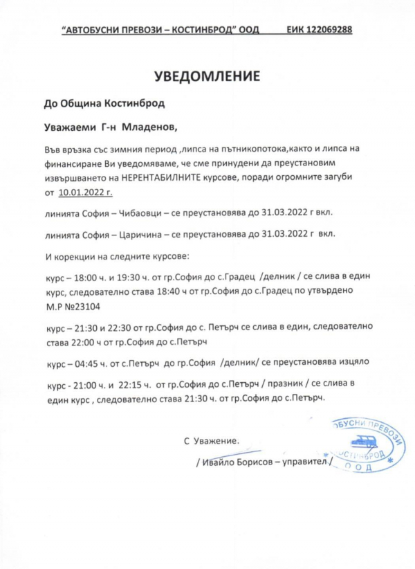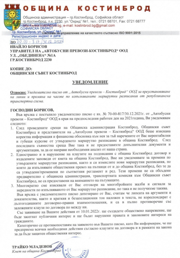 Междувременно на 30.12.2021г. Община Костинброд бе уведомена от превозвача от квотата на общината ни - „Автобусни превози - Костинброд“ООД за едностранно въвеждане на промени в утвърдените транспортни разписания, считано от 10.01.2022г., както следва: