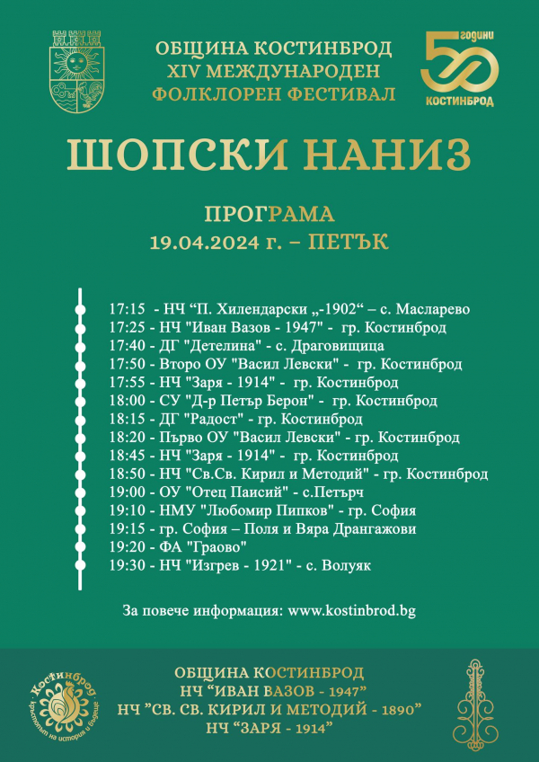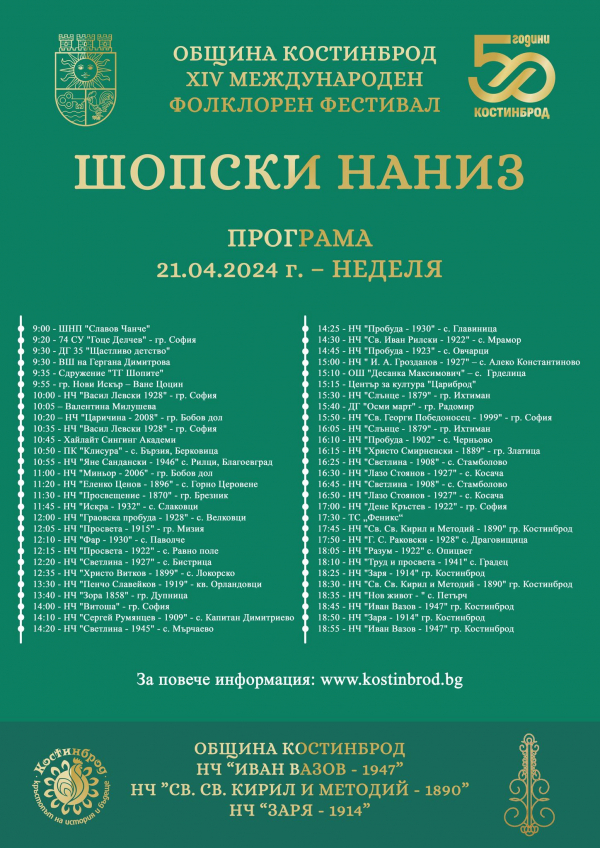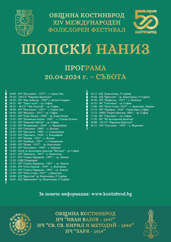 Вижте програмата за 14-ия Международен Фолклорен Фестивал "Шопски наниз", който ще се проведе на 19, 20, 21 април 2024 г. в гр. Костинброд: