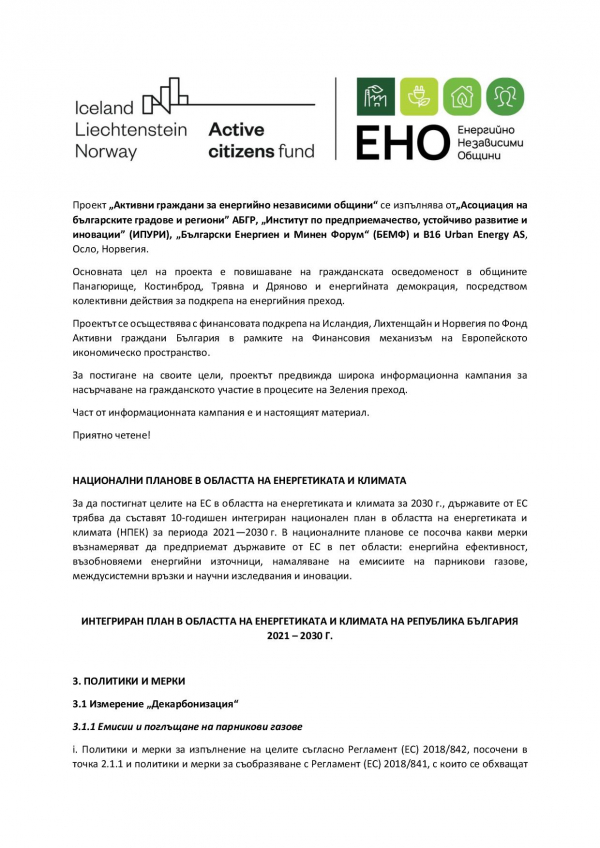 Проект „Активни граждани за енергийно независими общини“: Национални планове в областта на енергетиката и климата