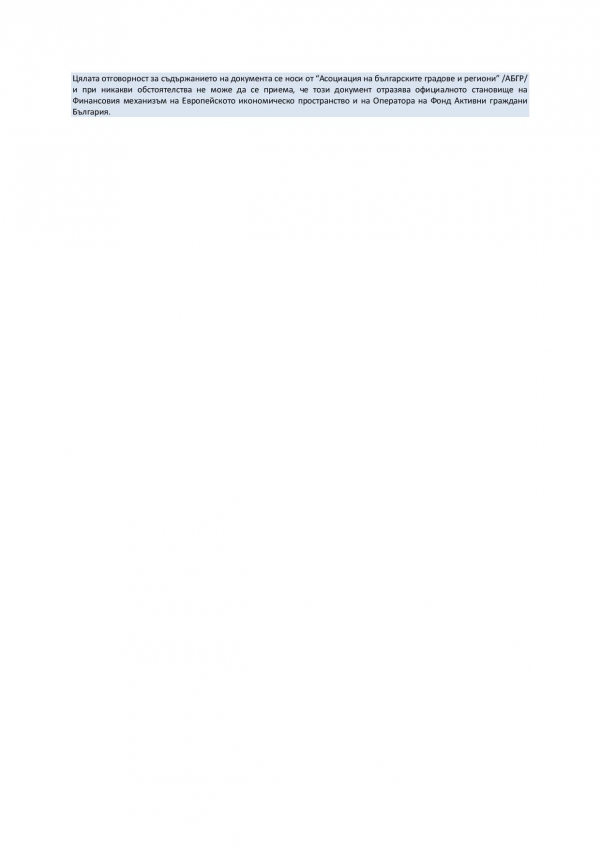 Проект „Активни граждани за енергийно независими общини“ се изпълнява от„Асоциация на българските градове и региони” АБГР, „Институт по предприемачество, устойчиво развитие и иновации” (ИПУРИ), „Български Енергиен и Минен Форум“ (БЕМФ) и B16 Urban Energy AS, Осло, Норвегия.