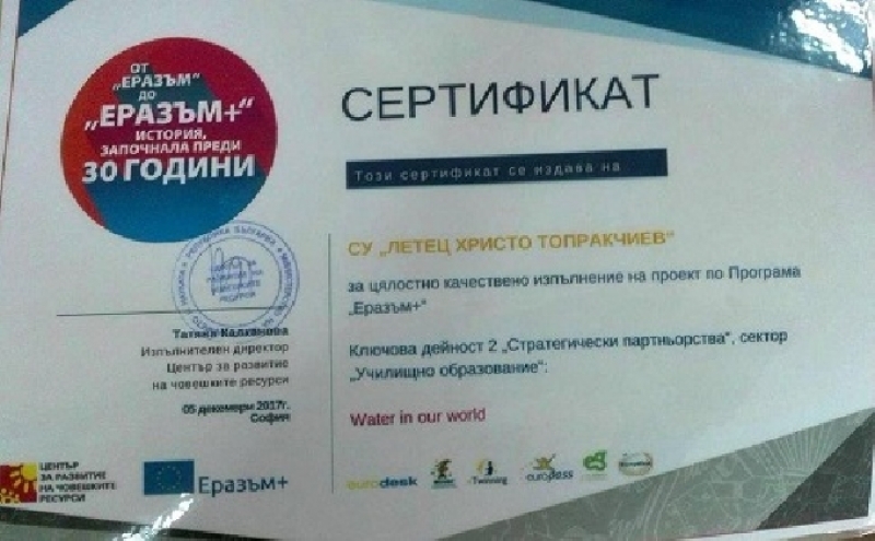Международният проект „Водата в нашия свят“ - WOW на СУ „Летец Христо Топракчиев“ бе награден за качествено изпълнение на проект по Програма Еразъм + по време на церемония за награждаване на отличени проекти за 2017 година в рамките на годишната валоризационна конференция по програмата.