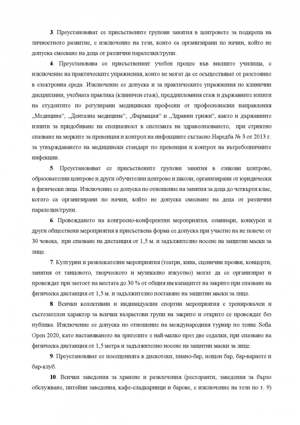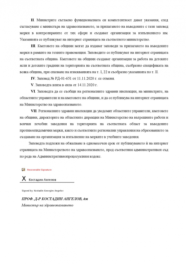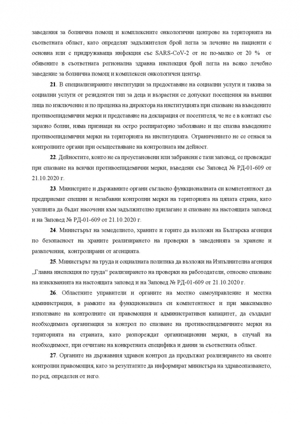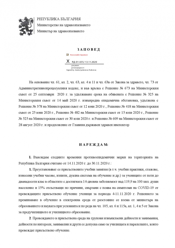 Това нарежда министърът на здравеопазването с издадена Заповед № РД-01-655/13.11.2020 г. Заповедта влиза в сила от утре, 14 ноември.