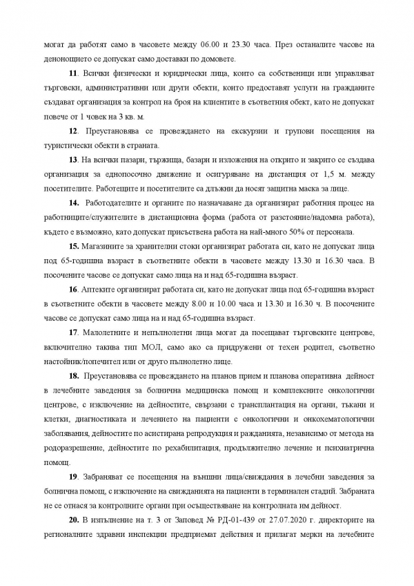 Аптеките организират работата си, като не допускат лица под 65-годишна възраст в съответните обекти в часовете между 08:00 и 10:00 ч. и 13.30 и 16:30 ч. В посочените часове се допускат само лица на и над 65-годишна възраст.