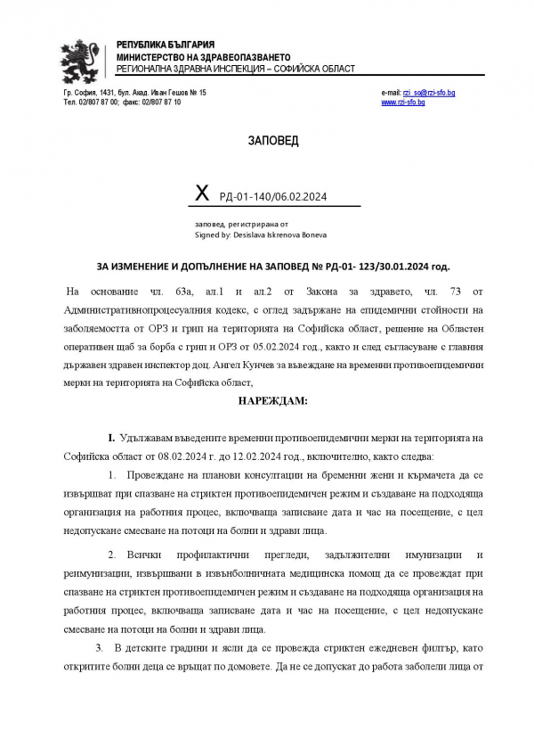 Временните противоепидемични мерки на територията на Софийска област се удължават до 12 февруари, включително. Това става ясно от заповед на директора на РЗИ-Софийска област – д-р Розалина Чобанова. Заповедта, която е публикувана на страницата на РЗИ-Софийска област, влиза в сила от 08.02.2024 г.