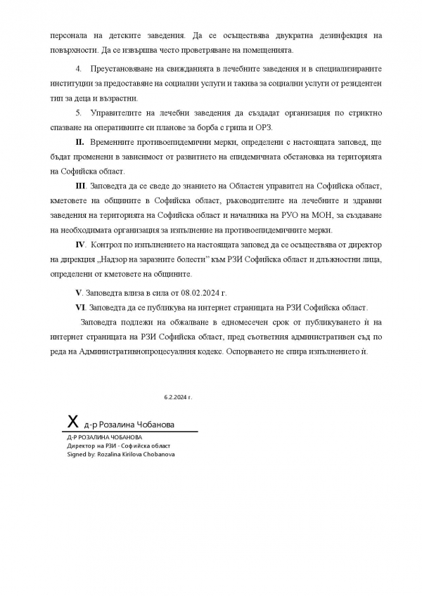 Директорът на РЗИ в Софийска област д-р Розалина Чобанова представи общата картина на заболяемостта в периода 29.01. 2024 г. - 04.02.2024 г. след предприетите временни противоепидемични мерки срещу разпространението на грип и ОРЗ.
