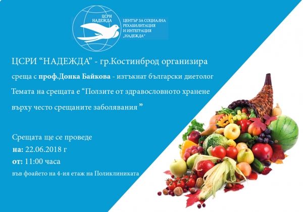 За ползите от здравословното хранене върху често срещаните заболявания ще разкаже на жителите на Костинброд изтъкнатият диетолог проф. Донка Байкова. Тя ще гостува в града по покана на Центъра за социална интеграция и рехабилитация „Надежда“.