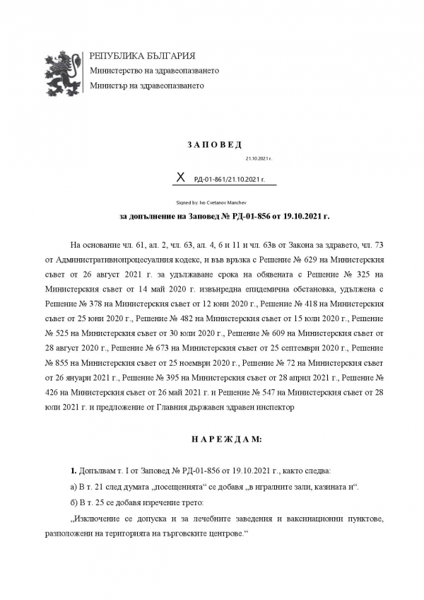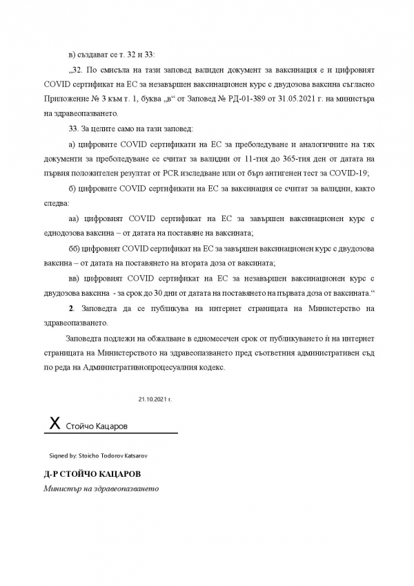 Излезе заповедта на здравния министър Стойчо Кацаров за въвеждането на "зелени сертификати" за достъп до обществени места. Валидността на сертификатите за преболедуване на COVID-19 е удължена от 6 на 12 месеца, като те ще могат да се ползват на територията на страната, за нуждите на държавния здравен контрол.