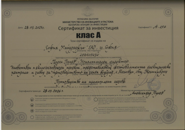 Богдан Богданов – изпълнителен директор на Българска агенция за инвестиции (БАИ), връчи сертификат клас А на „София Хайдръжан“ ЕАД. Чрез реализиране на одобрения проект компанията ще инвестира над 60 милиона лева в община Костинброд.