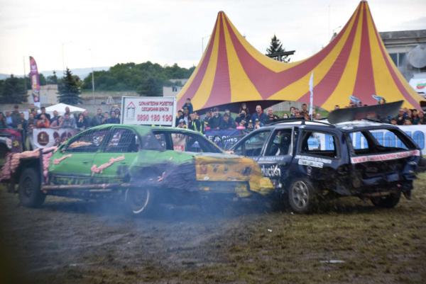 Над 15 автомобила, управлявани от своите автогладиатори, премериха битки в първия ден на "театъра на разрушението" – "Луда надпревара", в индустриална зона, гр. Костинброд.