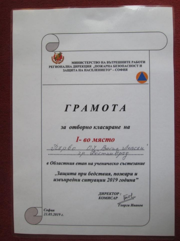 В оспорваното състезание между осем отбора от Софийска област, Диан, Инес, Симона и Цветан от VII клас показаха отлични знания на теста от първия етап и умения в центровете „Земетресение“, „Наводнения“, „Пожарна безопасност“, „Химически отровни вещества“ и „Първа помощ“. С преднина от над 10 точки те заслужено спечелиха първото място и ще представят Софийска област на Националното състезание, което ще се проведе в гр. Стара Загора в края на месец юни. Възпитаниците на Първо ОУ „Васил Левски” бяха наградени от Директора на РДПБЗН София - комисар Георги Иванов.