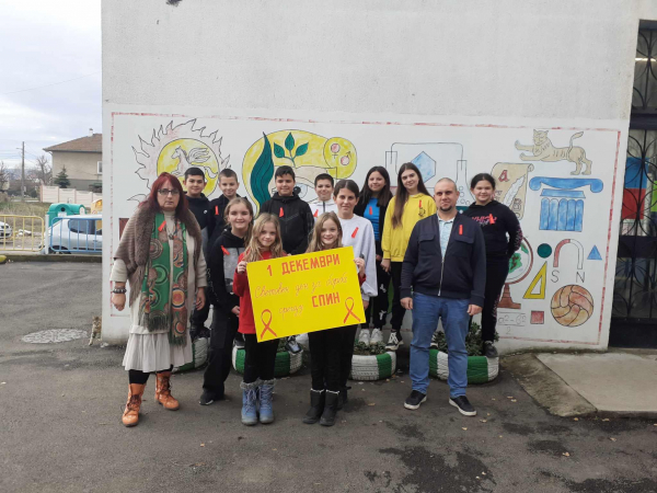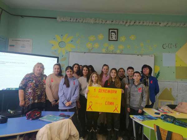 В знак на съпричастност на всички ученици беше поставена червена лента и засвидетелстваха своята ангажираност към световния проблем.