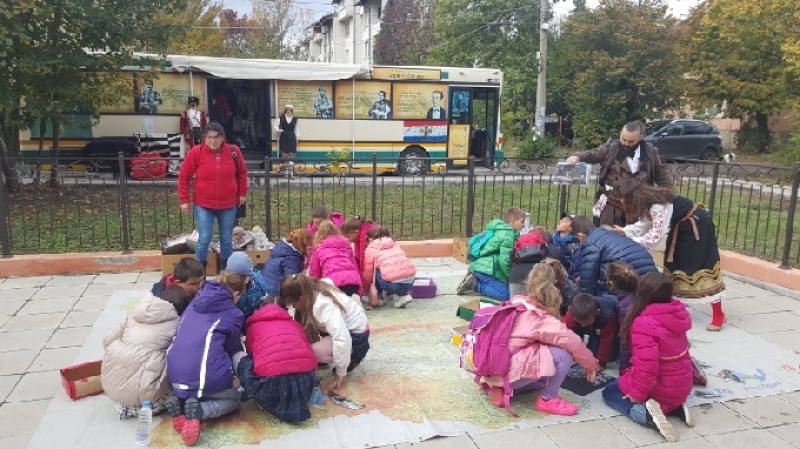 Ивайло Шопски и Калин Борисов – създателите на читалището на колела, от сутринта посрещат децата на ОДЗ „Буратино“ ,  ОДЗ „Детелина“ и учениците от първи до четвърти клас в СУ „Летец Христо Топракчиев“. Калин е опънал карта на България, подготвил е макети на забележителни сгради от цялата страна, пъзели с картини от родината и по забавен и интерес начин занимава децата с география и история. Негова помощничка е Свилена Петрова, доброволец  от Божурище, която заедно с децата подрежда макетите на сгради на съответните места на картата на България и помага в урока по родолюбие.