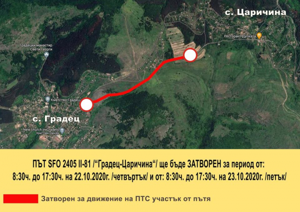 Път SFO 2405 II-81 - Градец-Царичина, ще бъде затворен за движение на пътни превозни средства за времето за времето от 08:30 ч. до 17:30 ч. на 22.10.2020 г. /четвъртък/ и от 08:30ч. до 17:30 ч. на 23.10.2020 г. /петък/. Това става ясно от заповед на кмета на община Костинброд Трайко Младенов, публикувана на интернет сайта на Общината. Причините за затваряне на пътя са строително-ремонтни дейности.