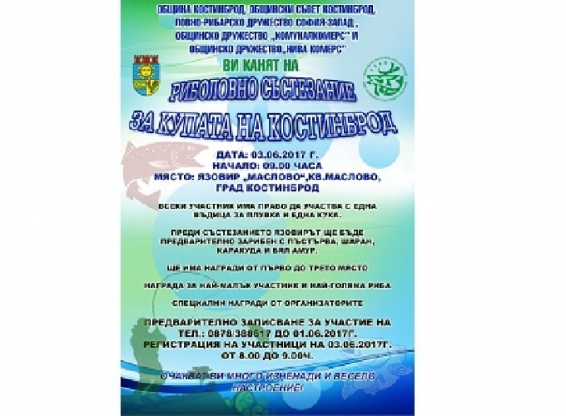 Риболовно състезание за купата на Костинброд организират на 3 юни местната администрация, Общинският съвет, Ловно-рибарско дружество София-Запад и общинските дружества „Комуналкомерс“ и „Нива комерс“.