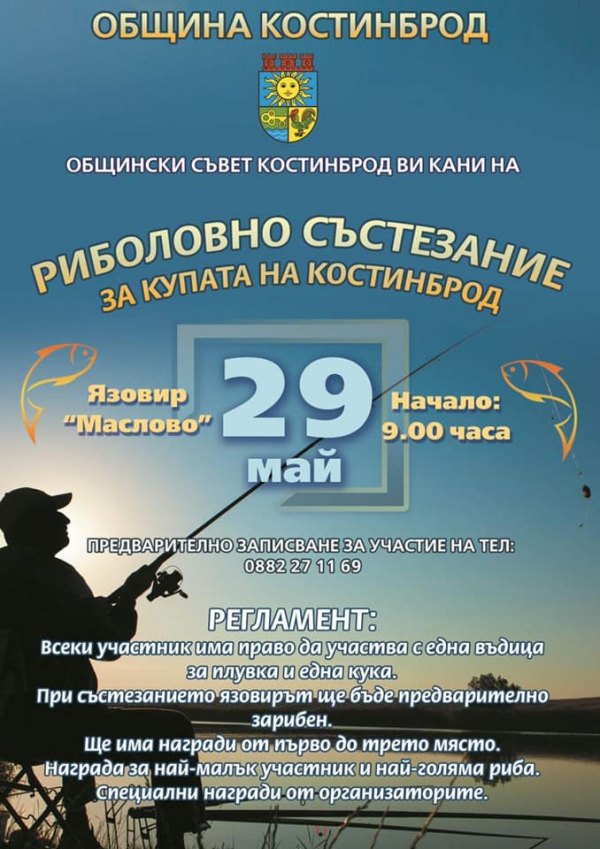 На 29 май ще се проведе тазгодишното Риболовно състезание за купата на Костинброд. Състезанието ще се проведе на язовир „Маслово“, а началният час е 09:00 ч.