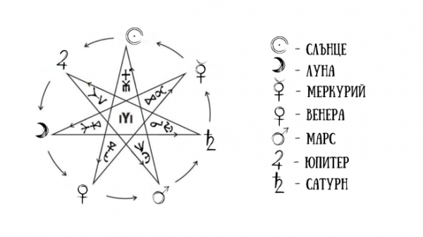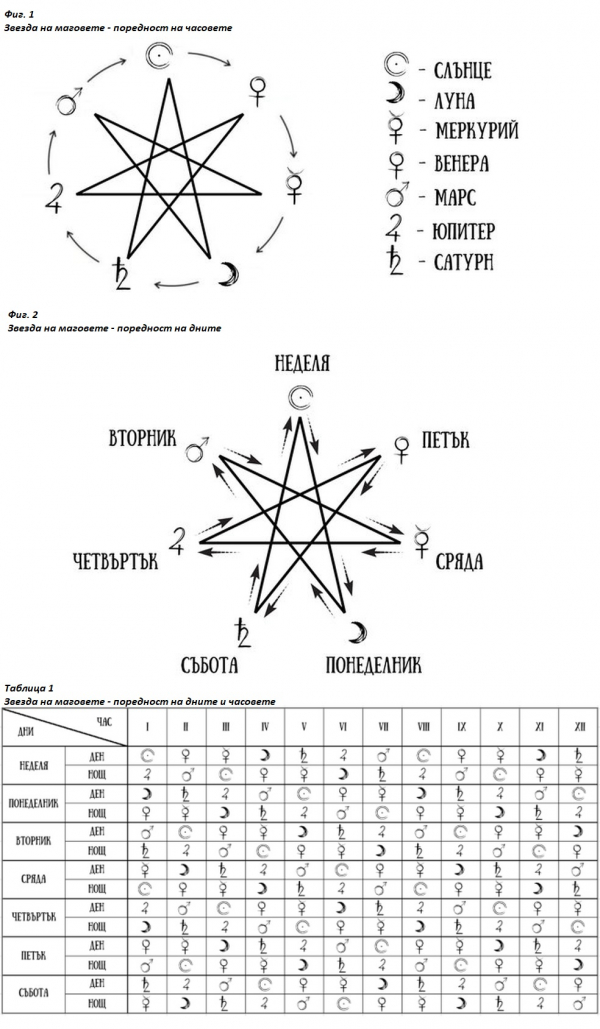 В древността разделяли денонощието на 24 части, като 12 части принадлежат на светлата част, от изгрев до залез, а останалите 12 на тъмната част, от залез до изгрев. Всяка част се нарича час и попада под управлението на дадена планета. Продължителността на всеки час се изчислява като реалното времетраене например на светлата част се раздели на 12 и се умножи по 60. Например, ако светлата част на деня е 13 часа, тогава получаваме 13:12х60 = 65, т.е. всеки час в този ден ще бъде с продължителност 65 мин. Планетата, която управлява първия час от деня, управлява целия ден. Началото на отброяването започва от върха на звездата. Това е първият час и ден от седмицата, първият ден от сътворението – неделя и негов управител е слънцето. Има две последователности в звездата, по часовниковата стрелка върви управлението на всеки час [фиг.1], а по посока на лъчите на звездата е поредността на дните [фиг.2]. Поредността по дни и часове може да се види в Таблица 1.
