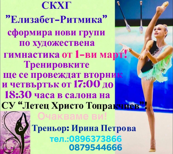 СКХГ „Елизабет-Ритмика“ сформира нови групи по художествена гимнастика, от 1 март. Тренировките ще се провеждат вторник и четвъртък от 17:00 ч. до 18:30 ч., в салона на СУ Летец Христо Топракчиев“, в гр. Божурище, а треньор на малките грации ще бъде Ирина Петрова.