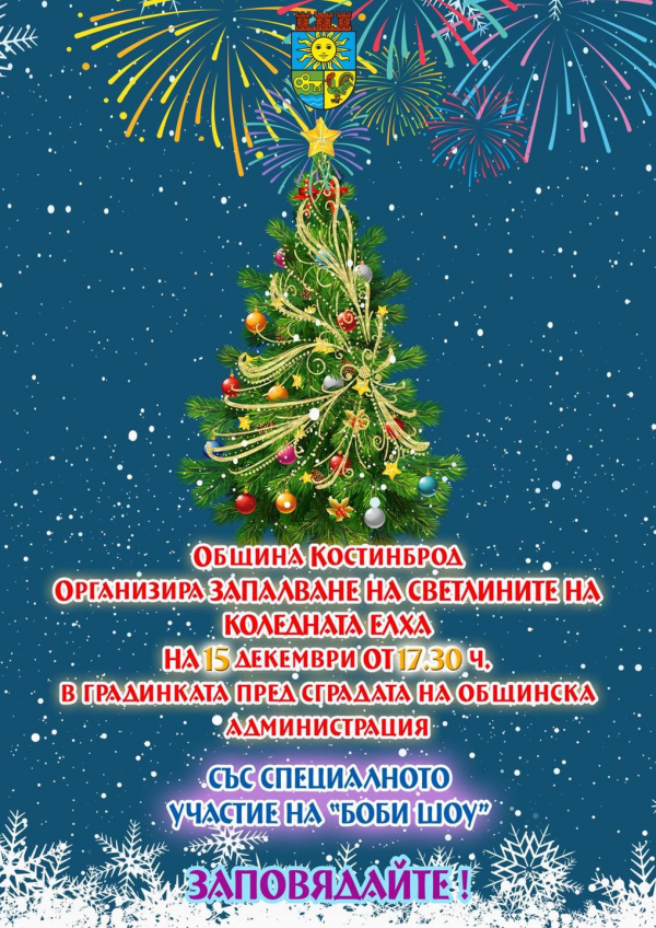 На 15 декември (сряда), точно в 17:30 ч., Коледната елха в Костинброд тържествено ще грейне в светлини. Елхата се намира в градинката пред сградата на Общинска администрация-Костинброд, а Община Костинброд кани всички жители и гостите на града да споделят вълнуващото събитие.
