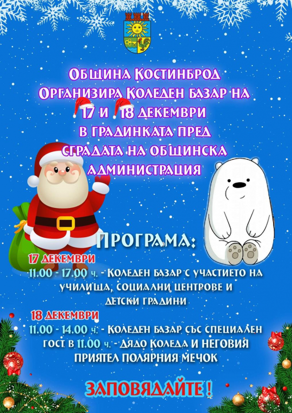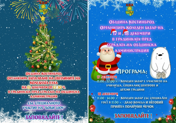 И тази година, традиционен Коледен базар ще зарадва жителите и гостите на Костинброд с ръчно изработени изделия. Той ще бъде разположен пред сградата на Общинската администрация и ще се проведе на 17 декември от 11:00 ч. до 17:00 ч. и 18 декември от 11:00 ч. до 14:00 ч.