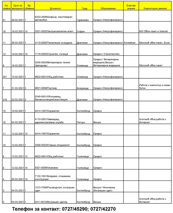 Сред позициите са: технически сътрудник, застрахователен агент, шофьор, портиер, охранител, ръководител вътрешен одит, завеждащ административна служба и други. За повече информация и контакти, вижте таблицата (кликнете за увеличение):