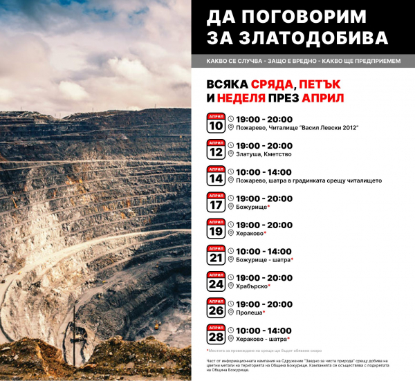 Цел на срещите: Информиране на обществеността и популяризиране на каузата „НЕ на златодобива в община Божурище“.