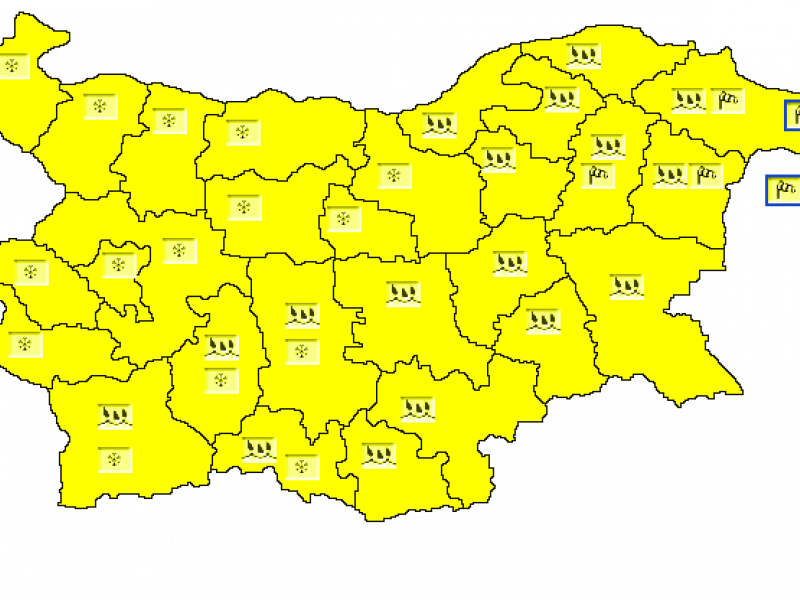 С опасни метеорологични явления започва седмицата в цялата страна. Обявен е жълт код, заради очакваните значителни валежи от сняг и дъжд. За Софийска област – от сняг. За утрешния ден предупредителният код ще бъде в сила отново за Софийска област, както и за Видин, Монтана, Враца, Плевен, Велико Търново, Габрово и Ловеч, където е възможно образуването на поледици.